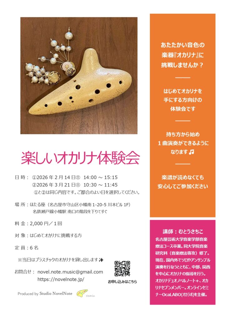初心者向け 名古屋 対面レッスン 経験者向け 【New!】楽しいオカリナ体験会(守山区) 日 時:①2026 年2 月14 日㊏ 14:00 ~ 15:15②2026 年3 月21 日㊏ 10:30 ~ 11:45①と②は同じ内容です。ご都合のよい日を選択してください。 場 所:ほたる座(名古屋市守山区小幡南1-20-5 川本ビル1F)名鉄瀬戸線小幡駅 南口の階段を下りてすぐ 料 金:2,000 円/1回 対 象:はじめてオカリナに挑戦する方 定 員:6 名 講師:むとうさちこ ※当日はプラスチックのオカリナを貸し出します✨ お申込みはこちらから